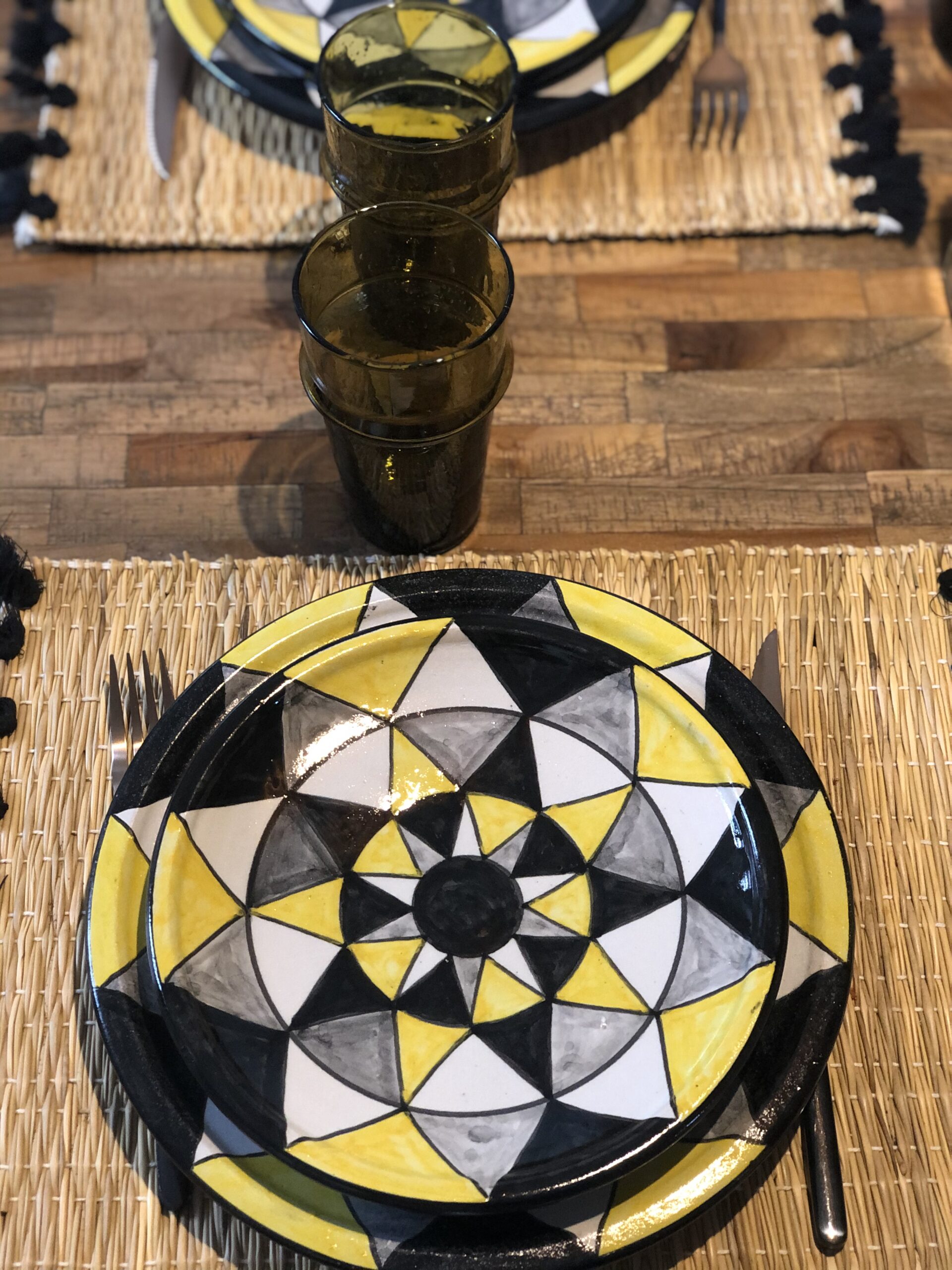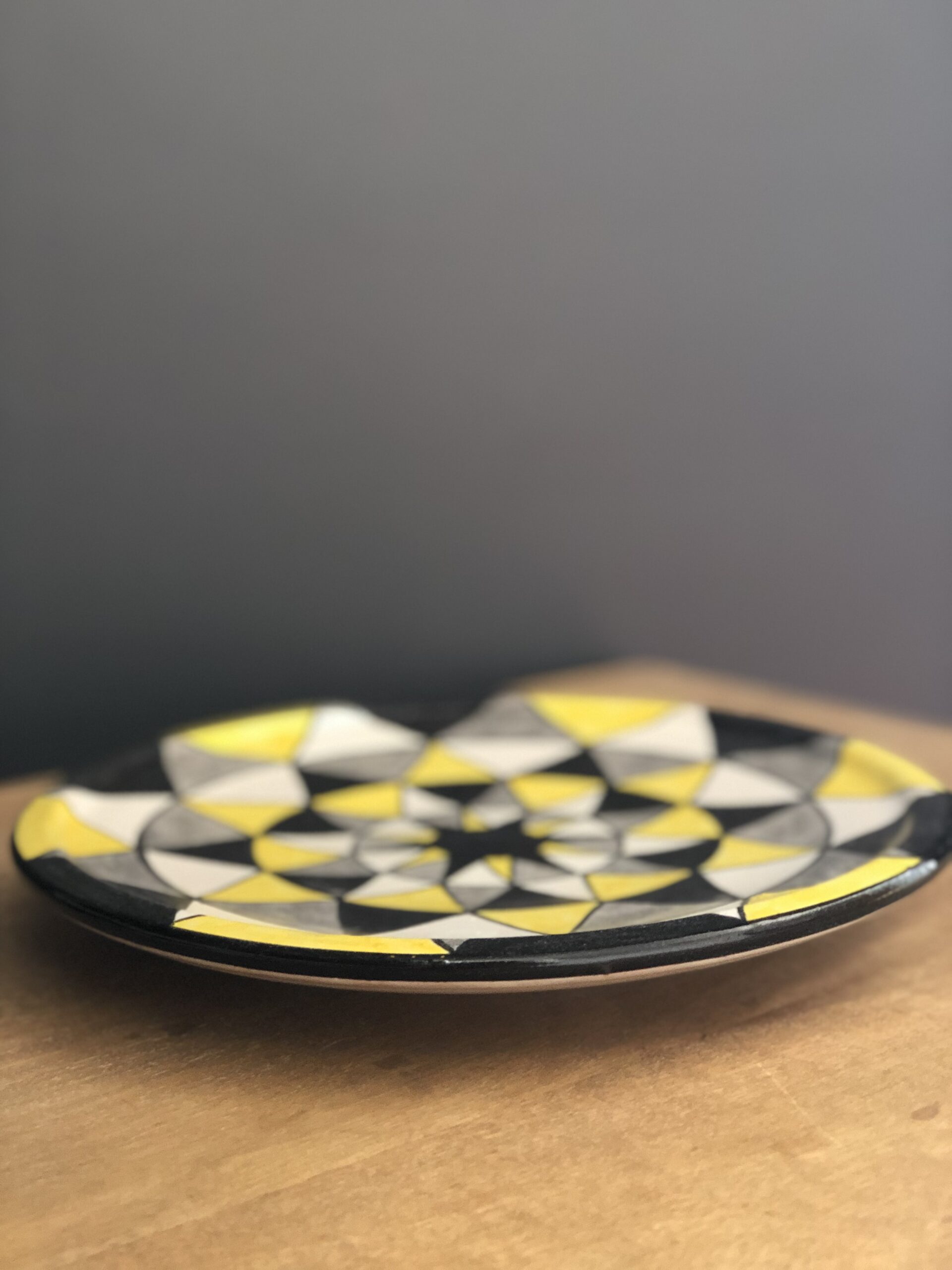 Assiette à dessert avec motifs triangles jaune et noir .
