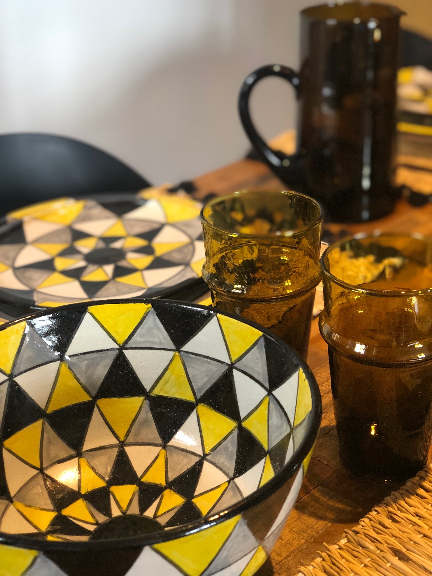 Assiette en terre cuite faite et peinte à la main par les potiers de Fès au Maroc, motifs triangle noir et jaune.