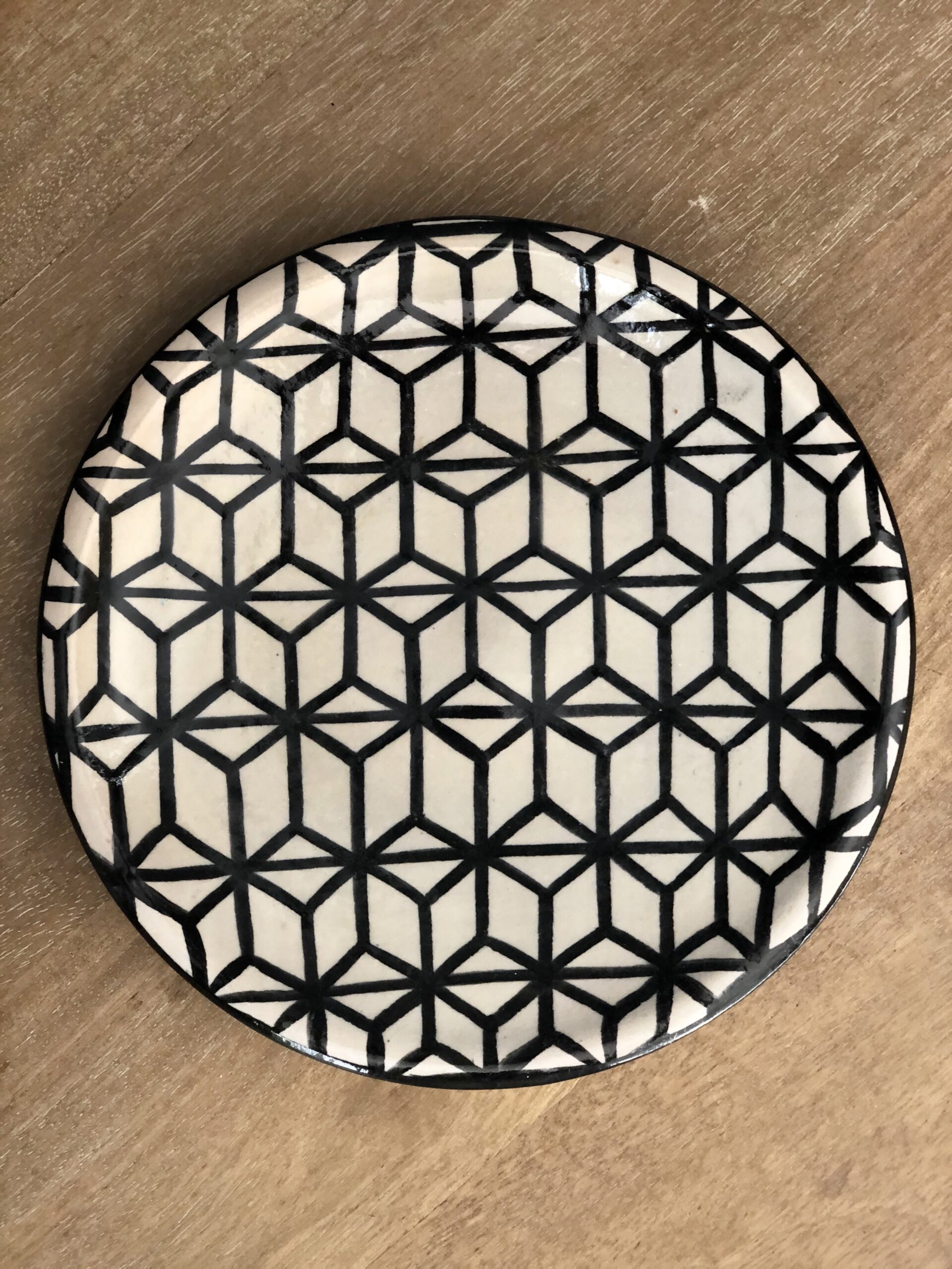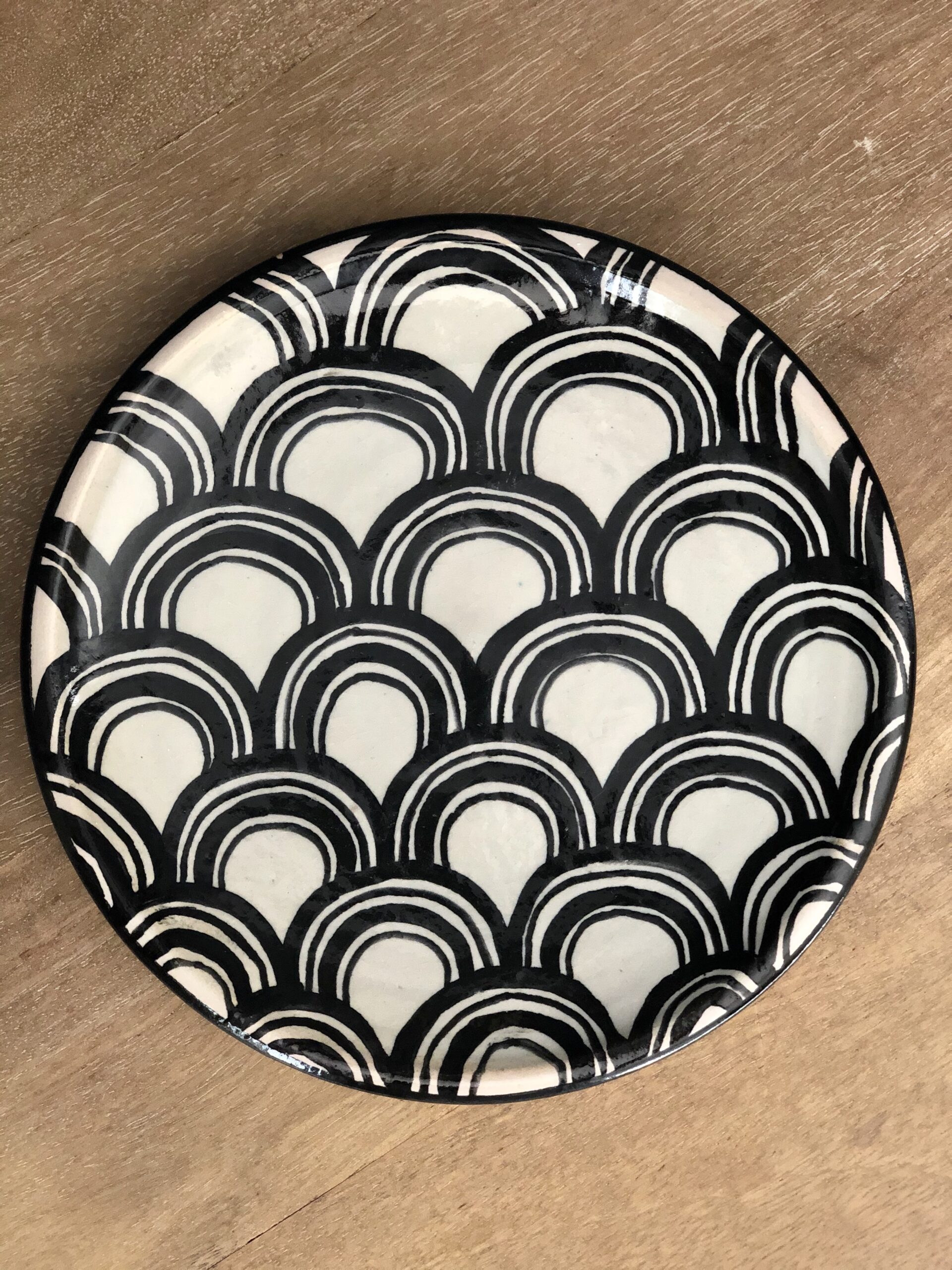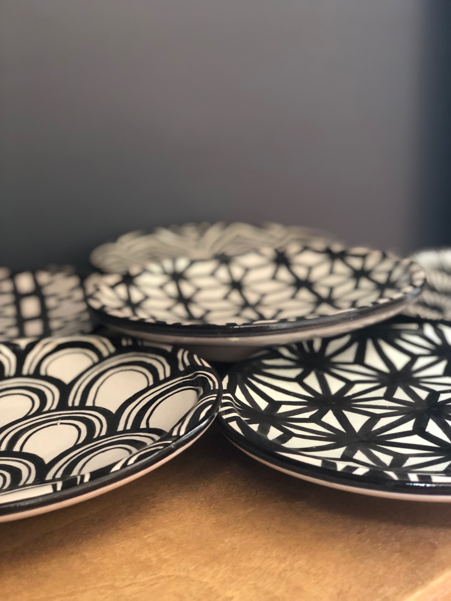 Série de 6 assiettes à dessert en terre cuite avec motifs Art Déco différents sur chaque assiette faites et peintes à la main par les artisans potiers de Fès au Maroc.