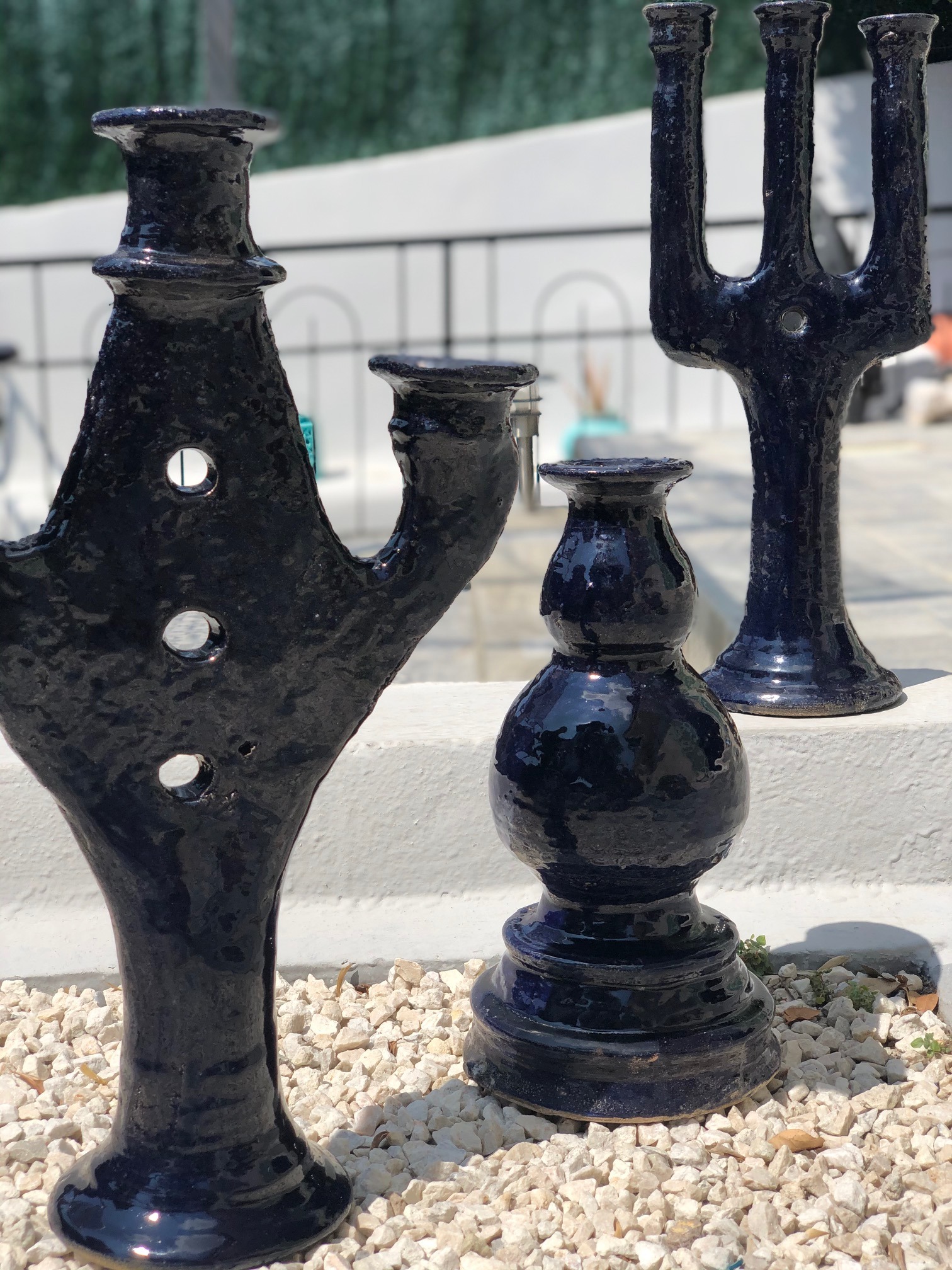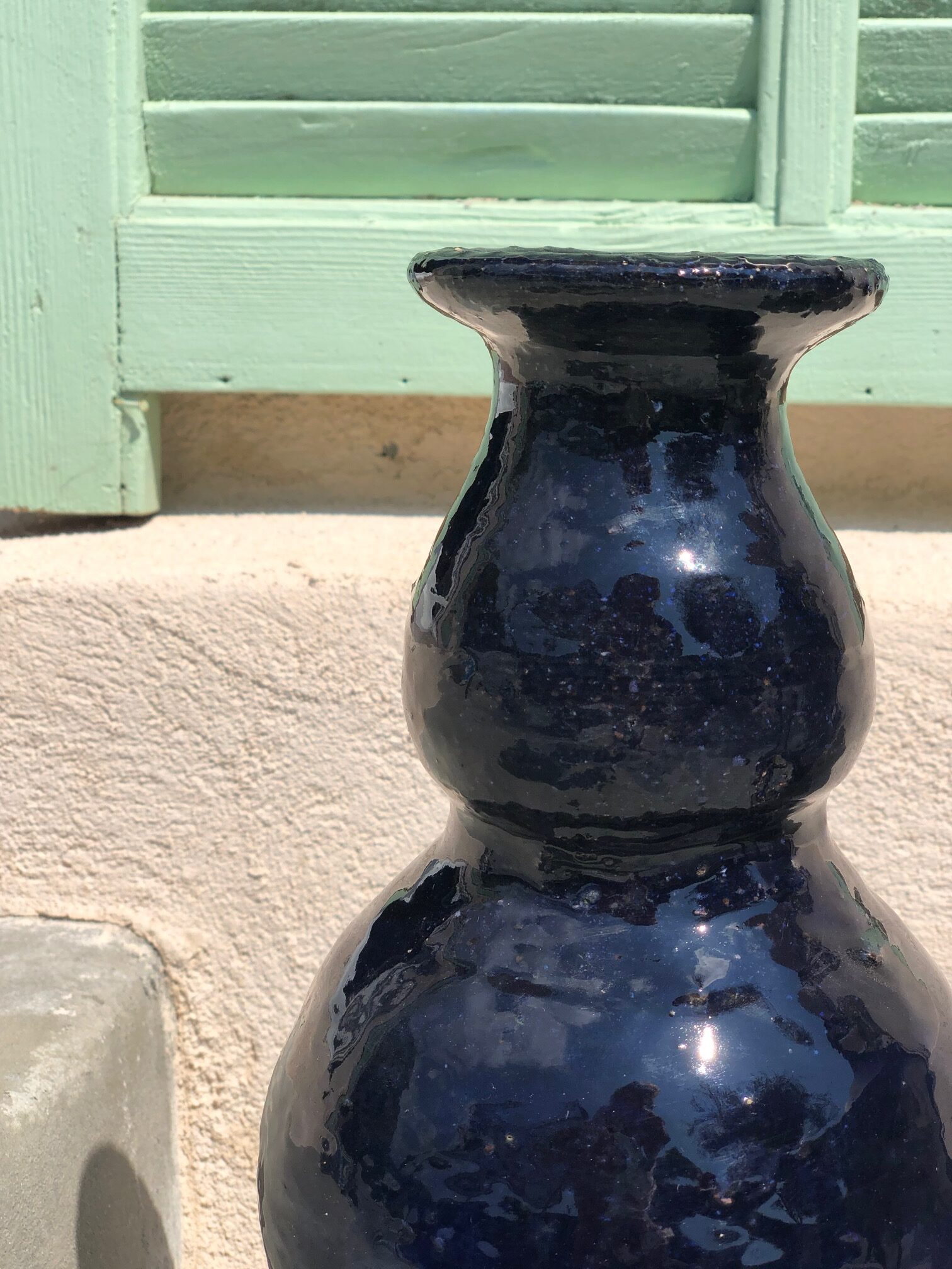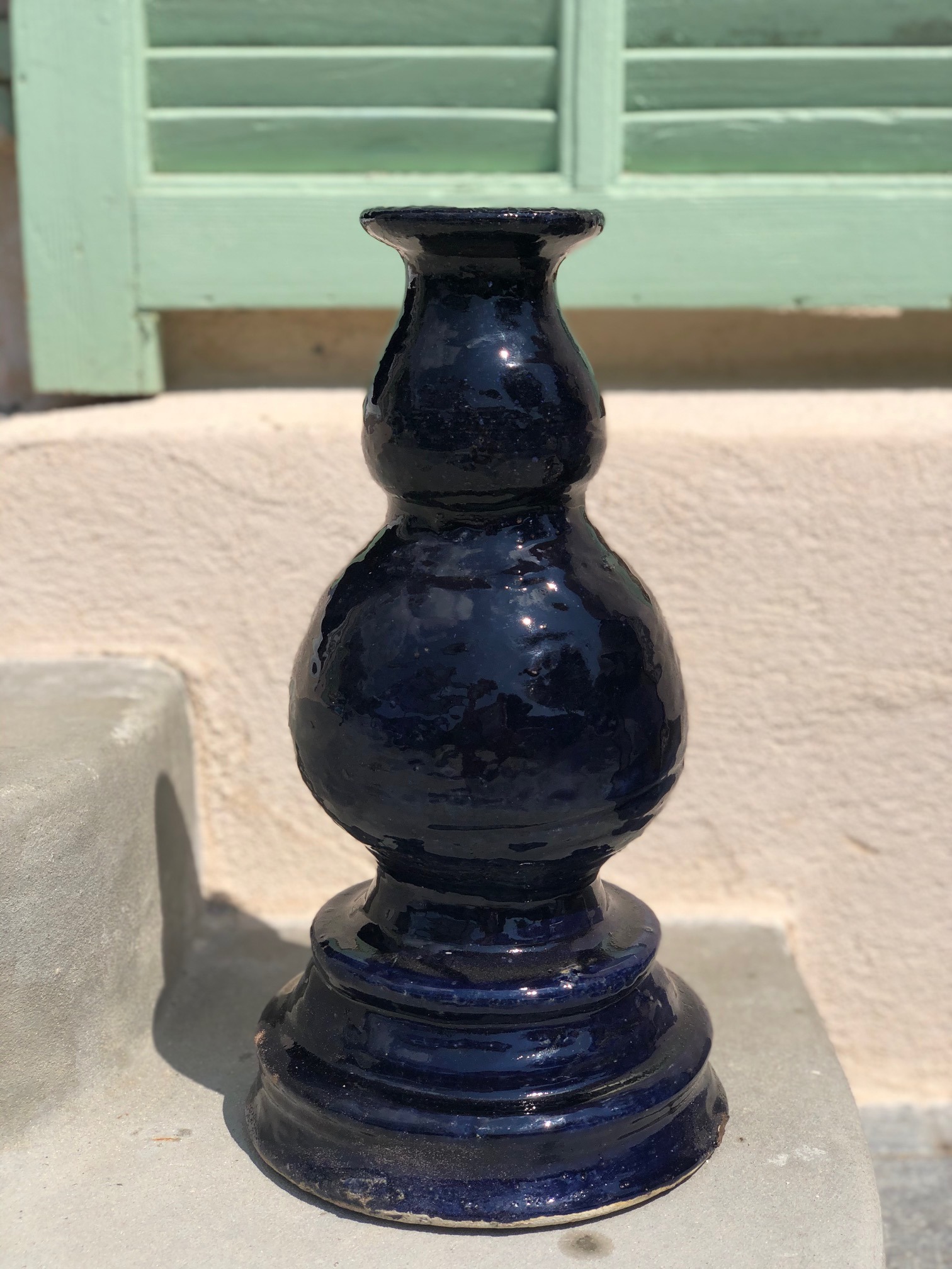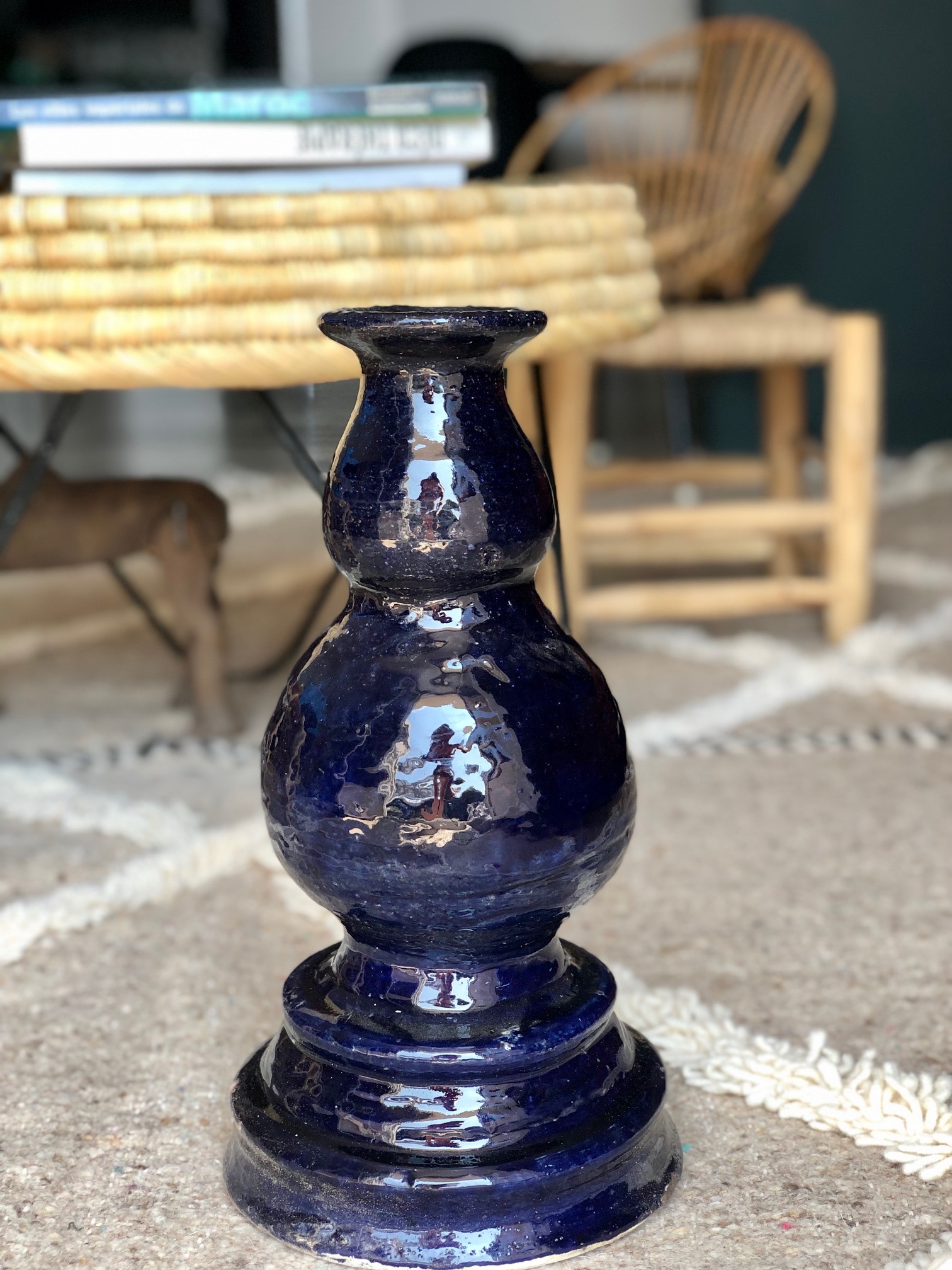 Bougeoir balustre en poterie traditionnelle de Tamegroute en argile émaillée bleu nuit fait à la main par les artisans potiers . Dim 37×20