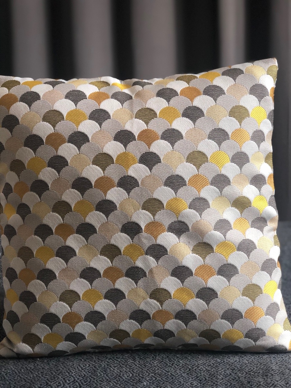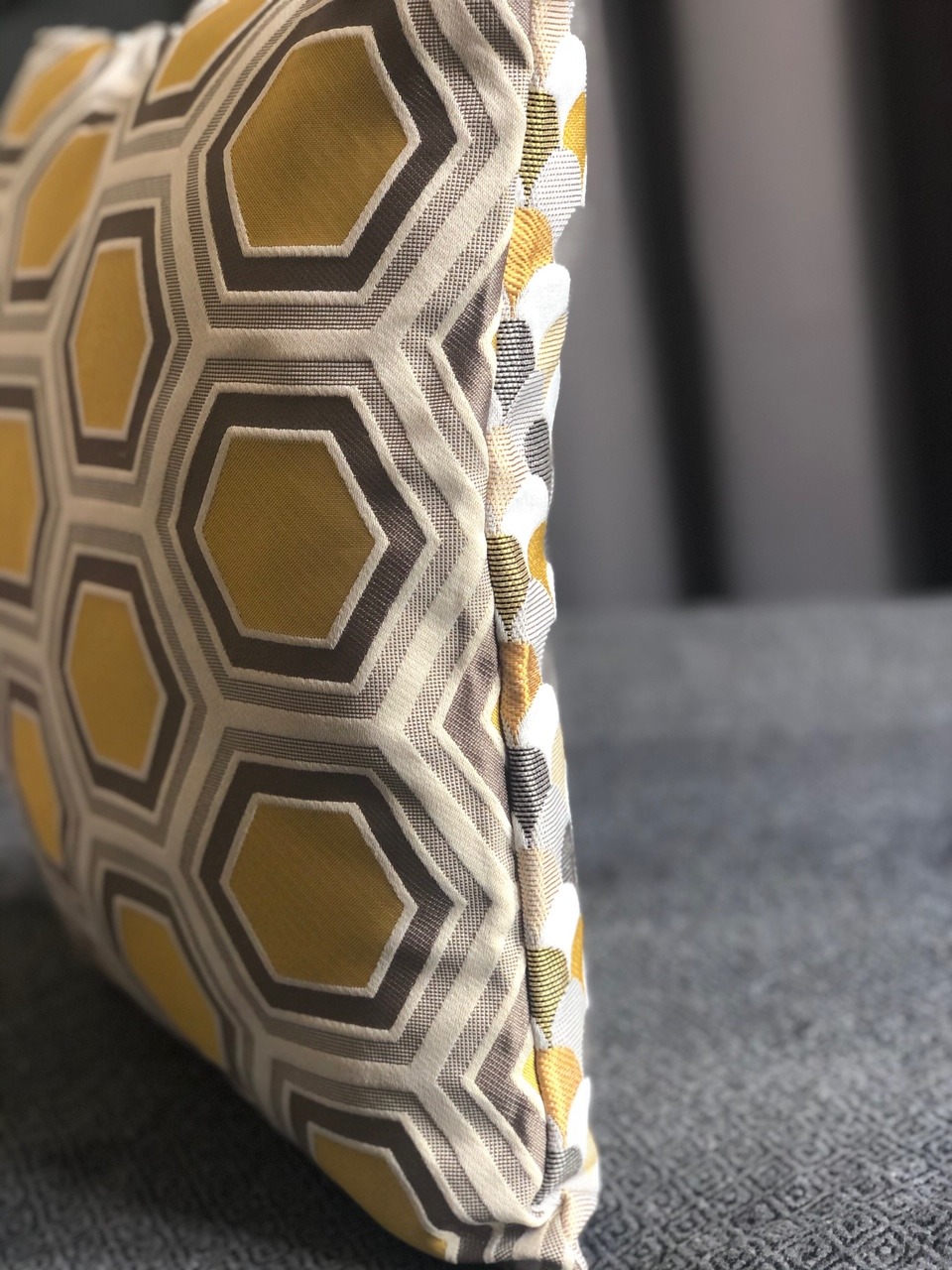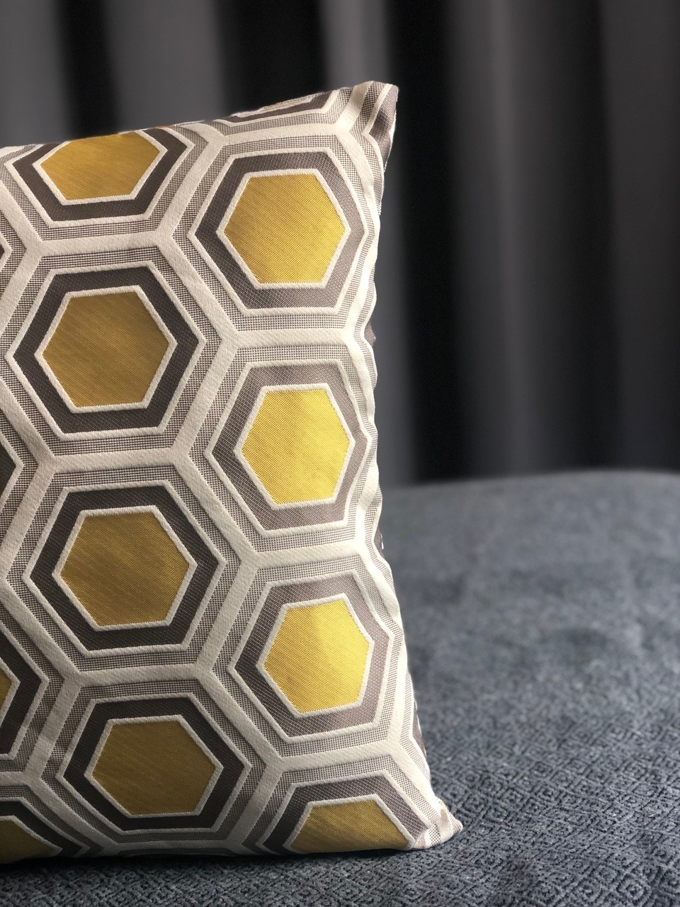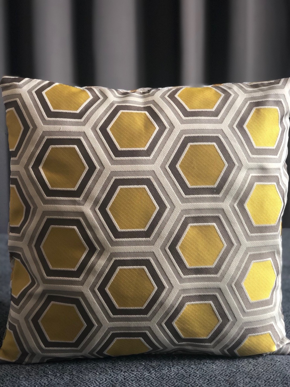 Housse de coussin carrée motifs alvéoles jaunes Art Déco en tissu cousue main.