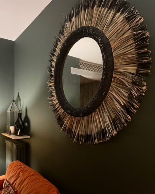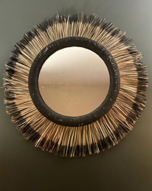 Grand miroir “soleil” en feuilles de palmier naturelles et noires tressées main par les artisanes marocaines.